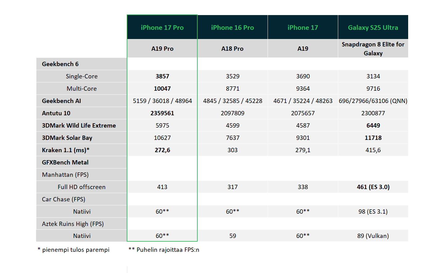 Applen uusi A19 Pro -piiri tarjoaa testiemme perusteella edellisen sukupolven iPhone 16 Pro -malliin verrattuna noin 10 % parantunutta prosessorisuorituskykyä sekä hieman testistä riippuen 20-30 % parantunutta grafiikkasuorituskykyä, eli kyseessä on tavanomaisen oloinen sukupolvipäivitys.