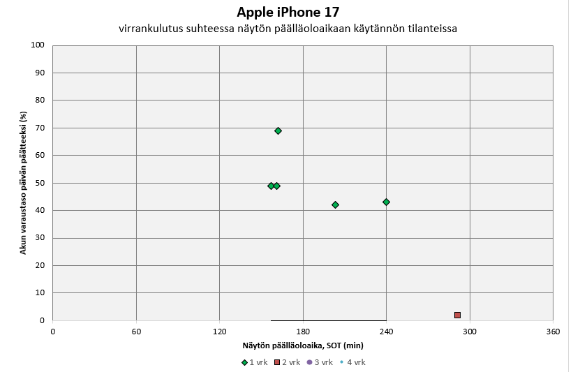 Akku iPhone 17:ssä on kasvanut hieman viime vuoden 16-perusmallista. Akunkesto testijaksolla osoittautui perushyväksi, mutta ei mitenkään markkinoilta poikkeuksellisesti erottuvaksi. Käytännössä puhelin kesti kovemmallakin käytöllä helposti yhden kokonaisen päivän ja kevyemmillä käyttöjaksoilla kahden päivän ylitys onnistui kohtalaisen vaivatta. Kuten kuvaajasta näkee, ei kahden päivän ylityksessä jäänyt jäljelle kuin muutamia prosentteja, mutta tulos on kuitenkin kohtalainen, sillä toinen päivä saatiin käyttökertana, jolloin yhden päivän aikana akkua oli jäänyt jäljelle alle 50 prosenttia ja käyttö sisälsi suhteellisen paljon internetselausta.