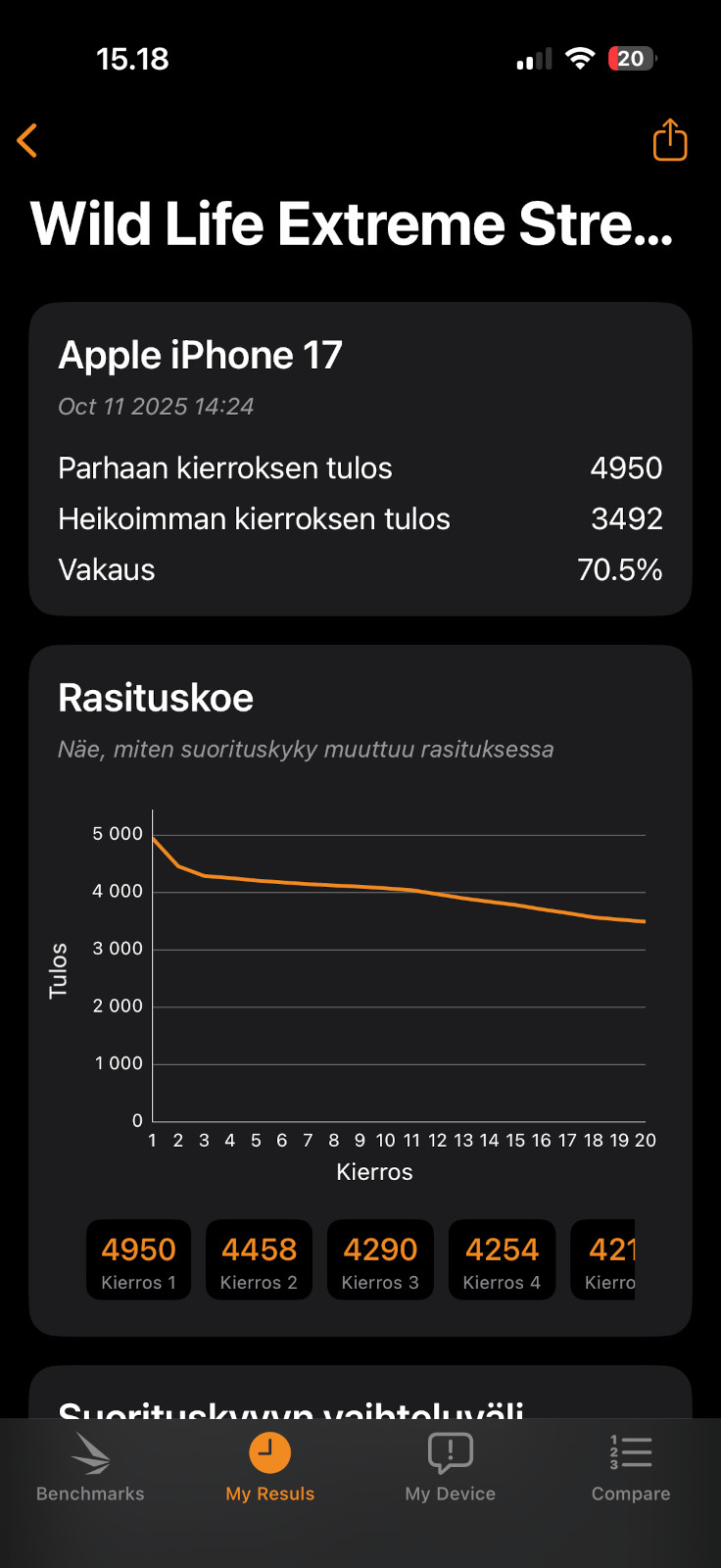 Pitkäkestoisessa rasituksessa iPhone 17 pärjää hyvin. Reilun 20 minuutin toistuvan Geekbench-rasituksen jälkeen prosessorisuorituskyky laski vain parilla sadalla pisteellä, eli tulos pysy huomattavan hyvänä. Grafiikkarasituksessa lasku oli selvempää, mutta silläkin rintamalla iPhone 17 pärjäsi ihan hyvin tuloksen pysyessä 70,5 prosentissa maksimista. Grafiikkatulos on erityisesti Samsungin Galaxy S25:een verrattuna hyvä, sillä kyseisen puhelimen paremmasta maksimituloksesta huolimatta sen heikoin tulos oli pitkässä rasituksessa iPhone 17:n saamaa heikompi.