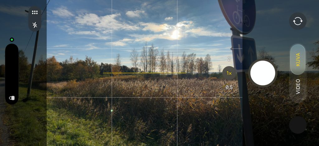 Kuvakulmien osalta tarjolla ovat pääkameraa käyttävä 1x, kyseisen kameran sensorilta rajauksella toteutettu 2x sekä ultralaajakulmakameran 0,5x. Mielenkiintoisesti Airista löytynyttä 1x-tilaa napauttamalla rajattavaa 35 mm:n kuvakulmaa perusmallin kamerasovellus ei tarjoa.