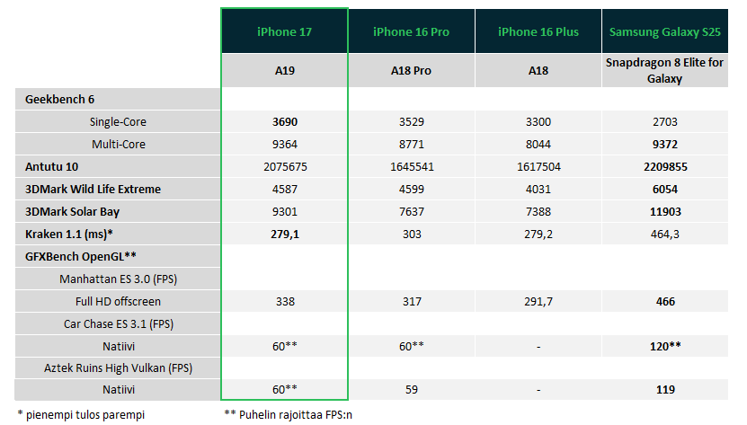 Suorituskykytesteistä on huomattavissa, että iPhone 17:n A19-järjestelmäpiiri on prosessoripuolella pykälän tehokkaampi kuin viime vuoden 16 Prossa käytetty A18 Pro. Grafiikkapuolella perinteisessä rasteroinnissa uusi perusmalli on käytännössä tasoissa 16 Pron kanssa häviten sille aavistuksen 3DMark Wild Life Extremessä, mutta voittaen sen GFXBenchin testeissä. Säteenseurantasuorituskykyä mittaavassa 3DMark Solar Bayssa uusi perusmalli onnistuu nousemaan edellisen Pro-mallin yläpuolelle. Viime vuoden 16 Plussan sisällä sykkineeseen A18:aan nähden uutuuspiiri tuo läpi linjan tasaisen parannuksen tuloksiin. Kuten Air-artikkelissa mainittiin iPhone 17 onnistuu mielenkiintoisesti olemaan pääasiassa hieman Airia tehokkaampi tai ainakin saman tehoinen, vaikka Airissa on käytössä paperilla tehokkaampi A19 Pro -järjestelmäpiiri, joskin leikatulla grafiikkaohjaimella.