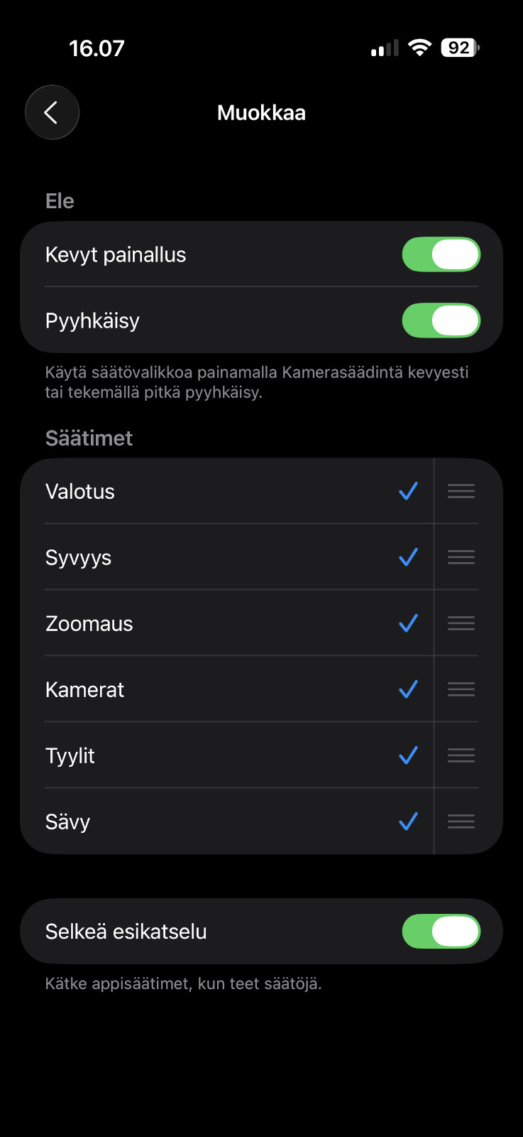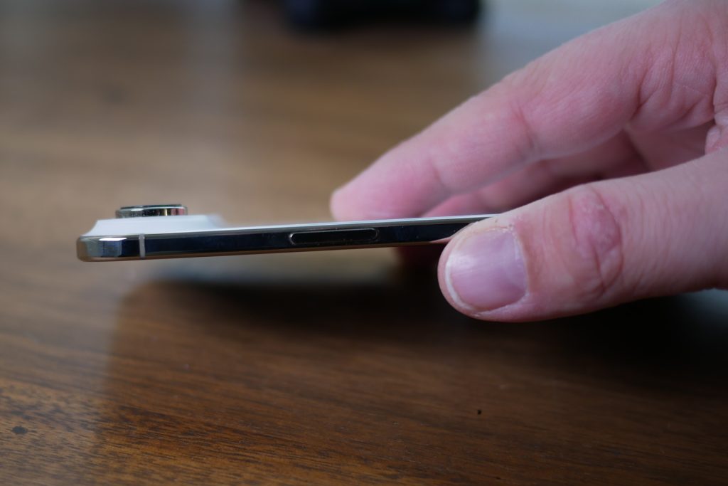 Puhelimen oikealla kyljellä sijaitsee edelleen iPhone 16 -mallistossa esitelty kamerapainike. Painike on edelleen yksiasentoinen, eli puolikkaalla painalluksella ei voi tarkentaa, mutta mukana ovat yhä viime vuonna esitellyt hipaisueleet, joilla sitä pitkin liu’uttaessa esimerkiksi zoomata kuvaa tai muokata jotain muuta kuva-asetusta. Painikkeen sijainti on edelleen omaan makuuni epäonnistunut, sillä se on vaakatasossa puhelinta pitäessä turhan kaukana keskellä ja pystyssä puhelinta pitäessä puolestaan hieman liian alhaalla.