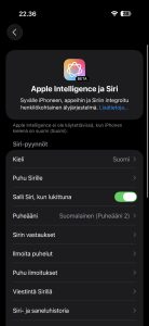 - Apple Intelligence tekoälytoiminnot eivät vieläkään toimi suomeksi.