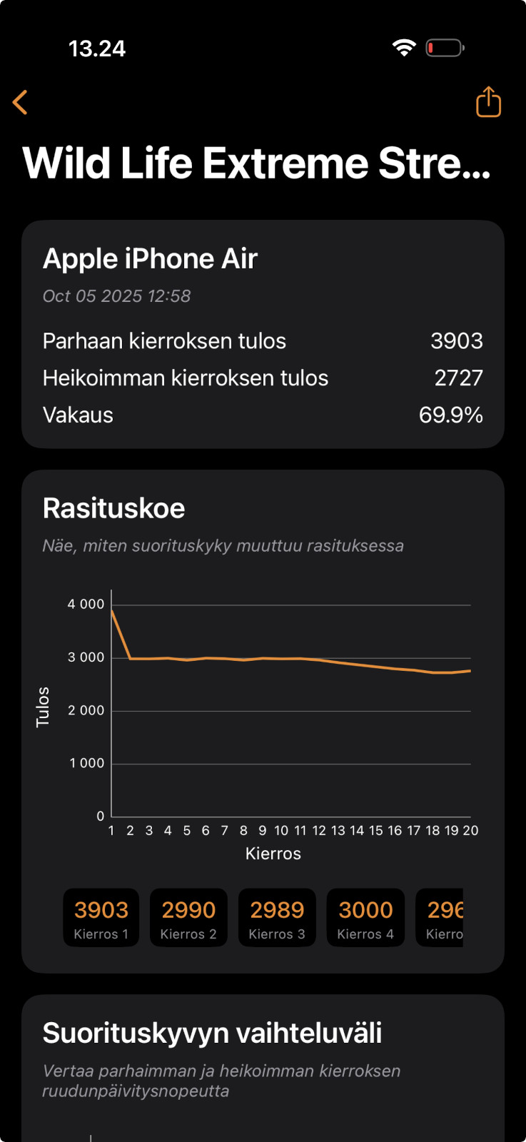 iPhone Airin suorituskyky tippuu rasituksessa kohtalaisen nopeasti ja parhaat tulokset saadaan vain hetkellisesti, mikä voinee selittää tasaista suoritusta 17-mallien kanssa paperilla tehokkaammasta piiristä huolimatta. Vajaan 20 minuutin toistuvan Geekbench-testin aikana prosessorisuorituskyky laski heikommaksi kuin viime vuoden 16 Prolla vastaavan testin jälkeen. Grafiikkapuolta rasittavassa 3DMark Wild Life Extreme Stress Testissä tulos laski 69,9 prosenttiin maksimista, mikä ei ole nykymarkkinoilla erottuvan huono tulos, mutta ei hyväkään. Suorituskyvyn lasku tapahtuu terävästi heti rasituksen alkupuolella, mutta pysyy tasaisena sen jälkeen.