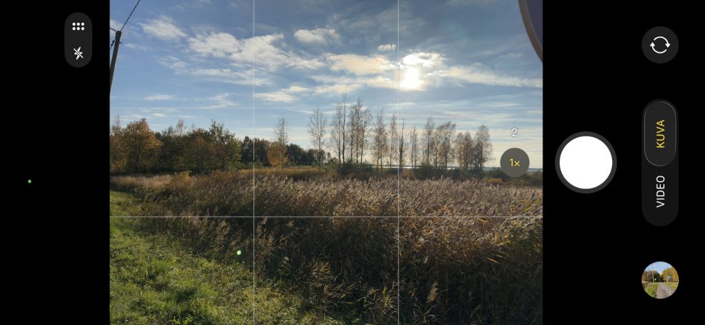 Pääkameran lisäksi sovellus tarjoaa 2x-tilan, joka ottaa kuvia suoraan sensorilta tehtävällä rajauksella. Lisäksi tarjolla on myös 1x-tilaa napauttamalla ilmestyvä rajaus 35 mm:n kuvakulmaan, eli pääkameran 26 mm:n ja 2x-tilan 52 mm:n väliin. Erillisen ultralaajakulmakameran puute on 1259 euron hintaan väistämättä miinus, sillä sen kuvakulmaa ei voi toteuttaa keinotekoisesti pääkameralta.