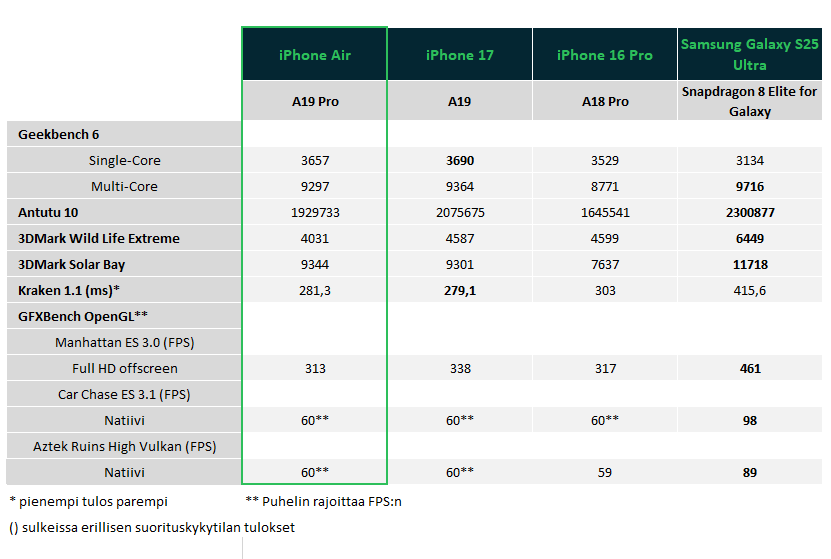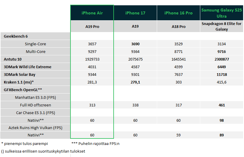 Kuten suorituskykytuloksista on nähtävissä iPhone Airin Pro-järjestelmäpiiri ei vaikuttaisi tarjoavan suoranaisesti Pro-piiristä odotettavaa suorituskykyä. Käytännössä puhelin on iPhone 17 -perusmallin tasolla niin prosessori kuin grafiikkasuorituskyvyssä useimmiten häviten testeissä jopa hieman. Tämä voinee olla suoraa seurausta puhelimen ohuesta rungosta, sillä paksuus asettaa väistämättä rajoitteensa jäähdytyssuorituskyvylle. Suorituskyky on silti kaikin puolin riittävää, mutta minkäänlaista parannusta perusmallin iPhone 17:ään ei Airin kanssa kannata odottaa.