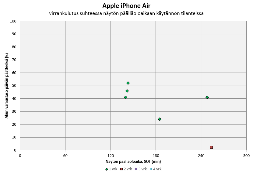 Jäähdytyksen lisäksi ohuus vaikuttaa puhelimen akun kokoon, joka on Airissa huomattavan pieni. Käytännössä akunkesto oli vastaavaa kuin kesällä testatussa Samsungin Galaxy S25 Edgessä: Yksi päivä on ylitettävissä helposti kovemmallakin käytöllä, mutta kahta kokonaista päivää puhelinta ei viikon aikana onnistuttu käyttämään kevyempienkään käyttökokemusten kanssa. Toisena päivänä puhelimen akku laski 2 prosenttiin jo kuudelta illalla ja puhelin oli ladattava ennen nukkumaanmenoa.