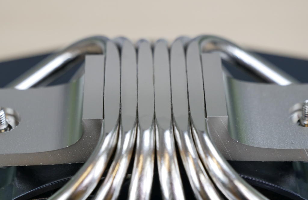 Pääosin edullisemman hintaluokan coolereista tuttuna ratkaisuna lämpöputket käyttävät pohjassa suorakontaktitekniikkaa. U:n muotoisia lämpöputkia on kuusi kappaletta ja ne ovat muodoltaan symmetrisiä. Pohjan kontaktipinta on myös poikkeuksellisen pienikokoinen, mittaustavasta riippuen noin 35 x 35 mm. Kontaktipinta on mittaustemme mukaan molempiin suuntiin varsin suora – lämpöputkien välillä on havaittavat raot. Maininnan arvoisena seikkana valmistaja suosittelee lämpötahnan levittämistä coolerin pohjaan lämpöputkiin nähden kohtisuorina raitoina. Pohjan yläpinnassa sijaitsevan asennuspalkin yläreunat on jätetty erittäin teräviksi ja onnistuinkin viiltämään syvän haavan peukaloon.