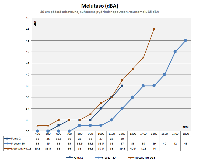 38 desibelin tasolle vakioituna Freezerin suhde verrokkeihin ei oikeastaan muutu mihinkään. Freezer saa ainakin teoriassa hieman etua hiljaisten tuulettimiensa korkeammasta pyörimisnopeudesta, mutta ei silti aivan yllä Noctuan ja Fuma 2:n tasolle. Lämpötilaerot ovat kuitenkin melko merkityksettömiä.