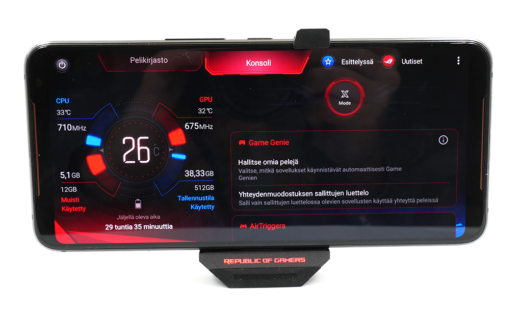 Pelaamista ajatellen puhelimesta löytyy Asuksen Game Genie -ominaisuus, joka voidaan ottaa esille myös kesken pelaamisen pyyhkäisemällä näytön vasemmasta reunasta. Game Genien asetuksissa säädetään mm. mahdolliset live striimaukseen käytettävät tilit ja palvelut sekä peleissä näytöllä näkyvä infokentän sisältö, johon saa näkyviin prosessorin ja grafiikkaohjaimen lämpötilat ja rasitusasteen, FPS:n sekä akkukapasiteetin.
