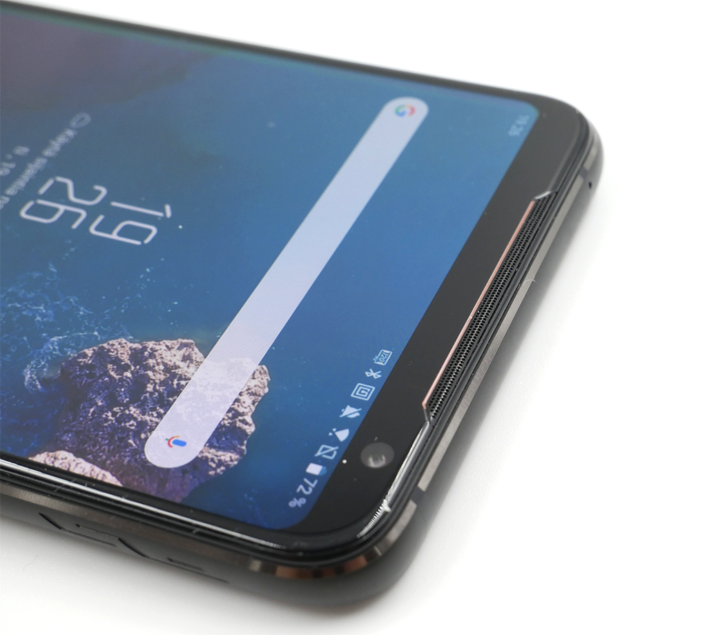 Kuten aikaisemmin mainitsimme, Asus on päätynyt säilyttämään näytön ylä- ja alapuolella sijaitsevat leuka- ja otsakaistaleen helpottaakseen puhelimen käsittelyä esimerkiksi pelikäytössä. Näytön yläpuolella olevaan kaistaleeseen on sijoitettu myös puhelimen toinen stereokaiutin, 24 megapikselin etukamera, kirkkaus- ja etäisyyssensorit sekä ilmoitusvalo.