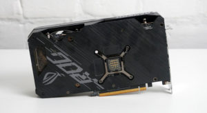 Takapuolella on jäähdyttämässä ja suojaamaassa alumiinilevy. Piirilevy on varustettu 8-pinnisellä PCI Express -lisävirtaliittimellä ja päädyn ROG Strix -logo on RGB-valaistu.