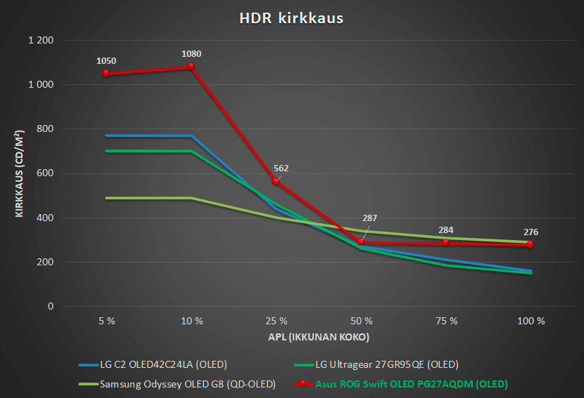Kun Uniform Brightness ei ole päällä, kirkkaus oli ikkunan koosta riippuen 271 – 560 cd/m² ja kuten graafista on nähtävissä, muissa io-techissä testatuissa OLED- ja QD-OLED-näytöissä Uniform Brightnessia vastaava tila on käytössä aina SDR-tilassa. Maksimikirkkaudeksi HDR-tilassa mittasimme 1080 cd/m², kun ruudun koko on 10 % tai alle. Näin ollen myös HDR-tilan maksimikirkkaus oli PG27AQDM:n kohdalla testijoukkomme toistaiseksi paras.