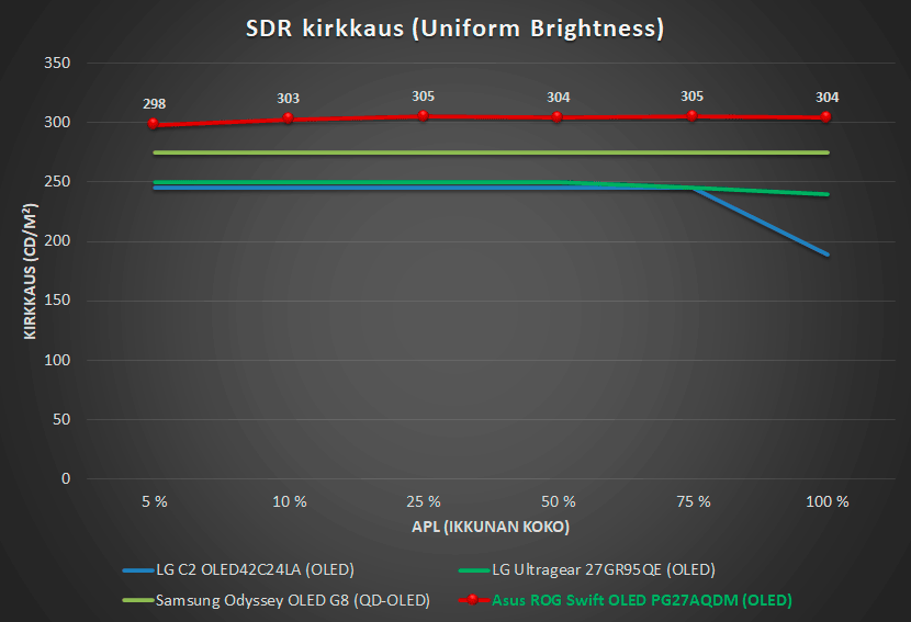 PG27AQDM:n mitattu maksimikirkkaus SDR-tilassa 100% valkoisella ikkunan koolla oli 304 cd/m², kun Uniform Brightness -tila oli kytkettynä päälle ja tällä tuloksella se on toistaiseksi io-techissä testatuista OLED- tai QD-OLED-paneeleista kirkkain.