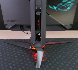 Jalustan muotoilu ja materiaalit mukailevat Asuksen lippulaivapelinäyttöjen jalustoja. Alaosan kolmijalka on metallia, runko-osa on päällystetty muovilla ja jalustan alaosan valolla voidaan heijastaa valmiita tai itse tehtyjä kuvia pöydän pintaan. Näytössä on 100×100 Vesa-kiinnitysstandardi ja virransyötöstä vastaa pienikokoinen ulkoinen virtalähde.