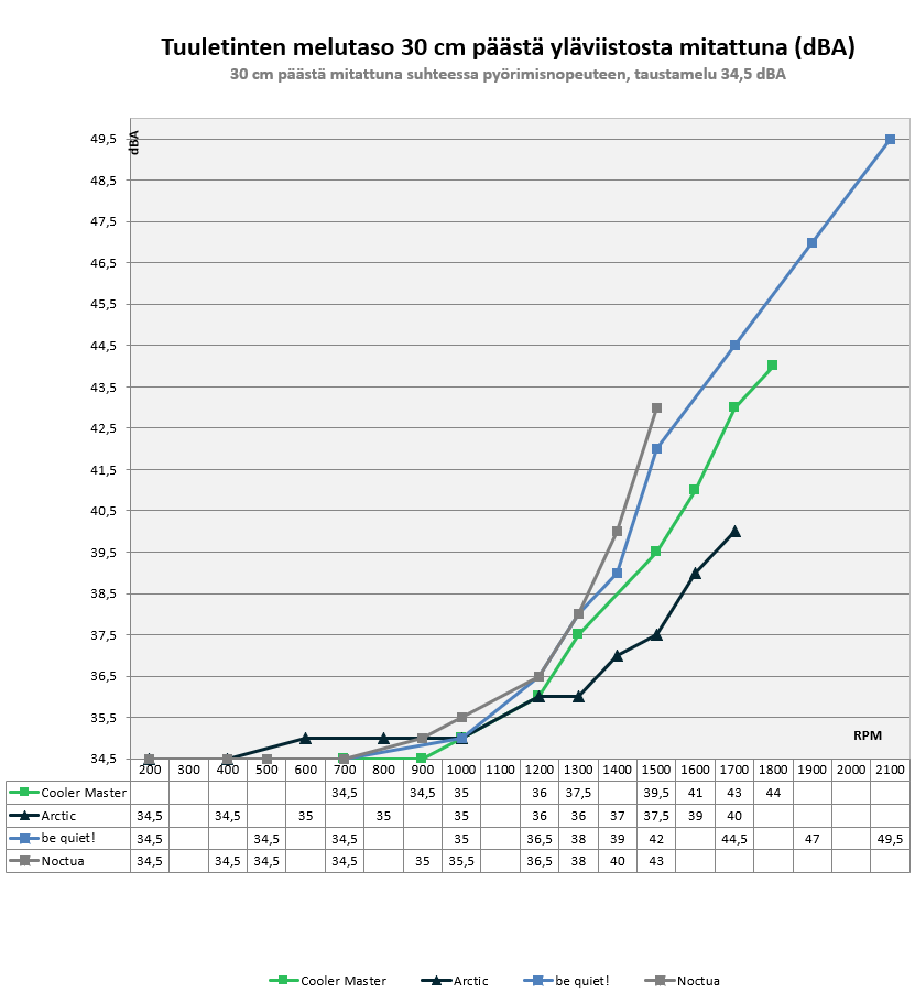 Testit ajettiin kahdella eri tuuletinnopeudella – täydellä teholla ja normalisoituna noin 38 desibelin tasolle. Jälkimmäinen mittaustapa on otettu mukaan testirutiiniin lukijoiden toiveesta. Näin saamme selville maksimaalisen jäähdytyskyvyn, johon cooleri yltää, mutta myös vertailukohdan kaikkien mallien välillä yhtenevällä ja normaalikäytön kannalta järkevällä äänentuottomäärällä.