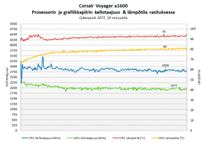 Huom! Olemme siirtyneet käyttämään pelitesteissä rasituksena Battlefield V:n sijaan Cyberpunk 2077:ää ja Handbraken sijaan Cinebench R23 -prosessorirasitusta. Edellisillä rasituksilla mitatut tulokset on merkitty kaavioon harmaalla.