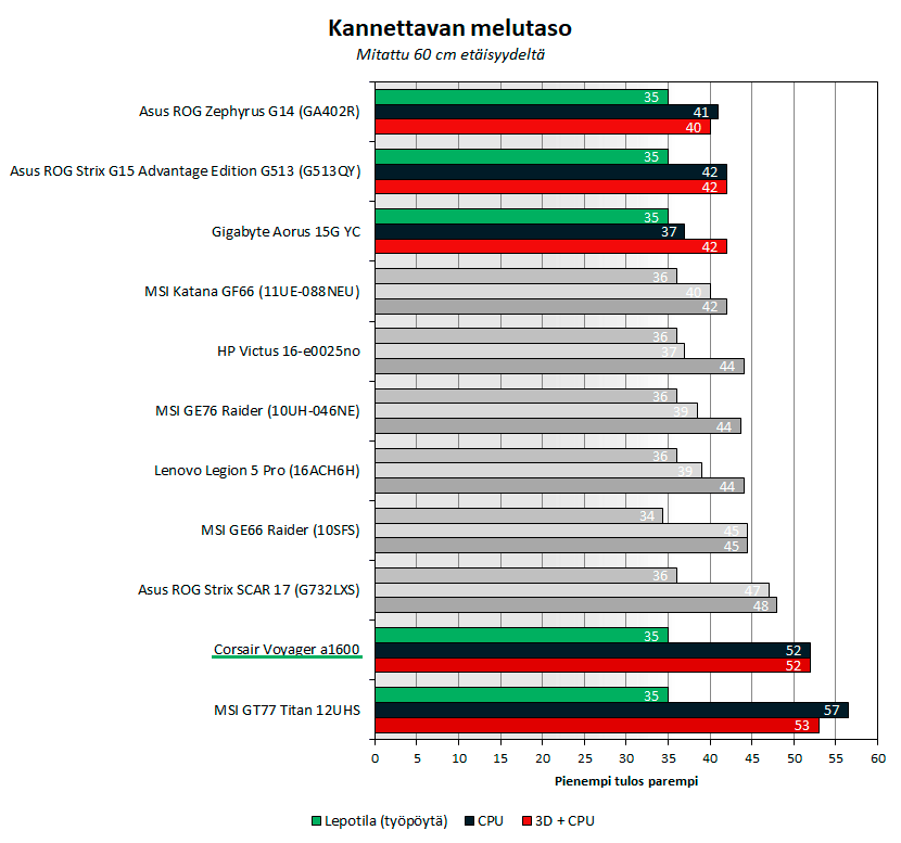 A-painotuksella suoritetuissa melumittauksissa Velleman DVM805 -desibelimittari sijoitettiin 60 senttimetrin päähän näytöstä. Kannettavan melutaso mitattiin lepotilassa Windowsin työpöydällä, prosessorirasituksessa Handbrake-ohjelmalla ja Cyberpunk 2077 -pelissä prosessorin ja näytönohjaimen yhteisrasituksessa. Virallisesti melua mitataan tiettyjen standardien mukaan, joten io-techin mittaukset ovat lähinnä suuntaa antavia.