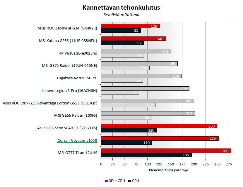 Corsair Voyager a1600:n akku kesti testissämme noin kaksi ja puoli tuntia sijoittuen akkukestonsa osalta vertailutaulukkomme viimeiseksi samalla tuloksella MSI Titan GT77 kanssa.