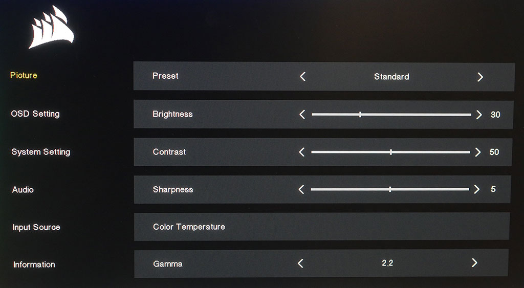 Näytön OSD-valikkoja ohjataan näytön takaosasta löytyvällä ohjaustikulla. Näytön sisäiset OSD-valikot ovat hyvin selkeät ja säädettävänä on kutakuinkin kaikki tarpeellinen värilämpötilasta eri overdrive-tiloihin. Näyttöä voidaan hallita myös Corsairin iCue-ohjelmalla, kun näyttö on kytketty tietokoneeseen USB-C -kaapelilla.