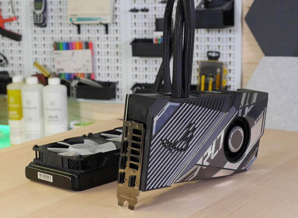 Asuksen nestejäähdytetty GeForce RTX 3080 Ti on kahden korttipaikan korkeuinen, näytönohjaimen pituus on 29,3 cm ja paino 1,55 kiloa. Näytönohjaimesta lähtee 60 cm pitkät letkut 240 millimetrin jäähdyttimeen ja kannattaa huomioida, että letkulähtöjen kanssa näytönohjain vaatii leveyssuunnassa noin 180 mm tilaa kotelossa. Letkujen punoksen sisään on integroitu siististi jäähdyttimen tuulettimien virta- ja RGB-kaapelit. Näytönohjaimeen on upotettu 80 mm:n radiaalituuletin, joka työntää ilmaa jäähdytysrivaston läpi ulos kotelosta. Tuulettimet ovat lepotilassa pois päältä ja alkavat pyöriä, kun grafiikkapiirin lämpötila nousee yli 47 asteeseen. Vakiona käytössä on OC-tila, mutta näytönohjaimesta löytyy BIOS-kytkin hiljaiselle tilalle.