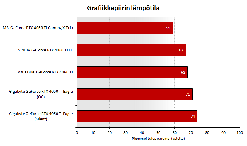 Testijoukon viileimpänä 59-asteisena toimi MSI:n Gaming X Trio ja lämpimimpänä Gigabyten Eagle-malli 74-asteisena.