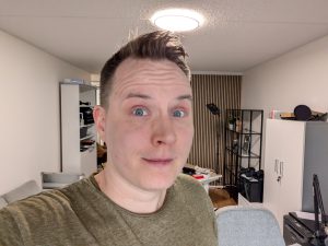 Selfie-kamerat jatkavat perustason suorittamisella. Kuvien yleisilme on luonnollinen, mutta vaikka kyseessä on automaattitarkenteinen kamera, jää yksityiskohtien toisto melko pehmeäksi. Etukamerat pystyvät tuottamaan käyttökelpoisia kuvia myös heikommassa valossa, joskin havaitsimme heikoimman valaistuksen otoksessa paidassa ja taustassa ilmeisesti tekoälyn luomia erikoisia tekstuureita, joita kohteesta ei todellisuudessa löydy.