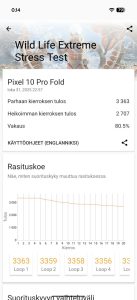 Taittuvissa puhelimissa rakenne asettaa oman haasteensa piirin jäähdytykselle, eikä Google tunnu löytäneen salaista asetta sen selättämiseen. Edeltäjämalliin nähden Pixel 10 Pro Fold itseasiassa rajoittaa suorituskykyään prosessorin osalta suhteessa vielä enemmän, sillä pitkäkestoisessa prosessorirasituksessa CPU Throttling Test -testisovellus antaa heikohkon 54 % tuloksen. 20 minuutin grafiikkarasitustesti 3DMark Wild Life Extreme Stress Test puolestaan antoi varsin hyvän noin 80 % tuloksen ja suorituskykytaso laski melko tasaisesti rasituksen aikana.