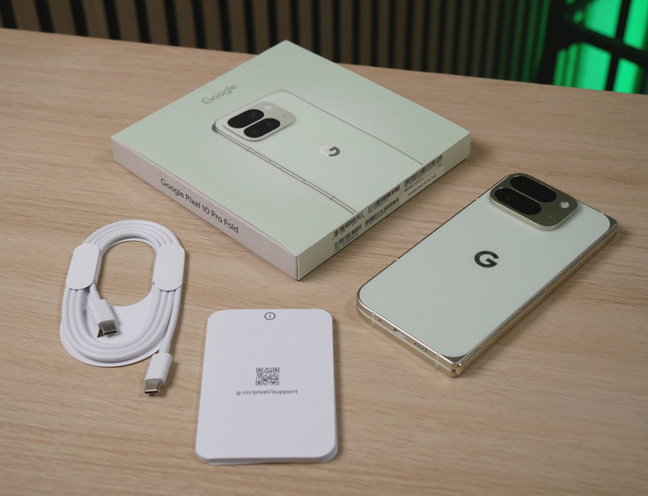 Pixel 10 Pro Foldin tuotepakkaus on tuttu edellismallista. Litteä neliskanttinen pahvirasia on varustettu erillisellä kuoripahvilla, jossa on puhelimen kuva. Pakkauksessa on puhelimen ohella seuraavat oheistarvikkeet: