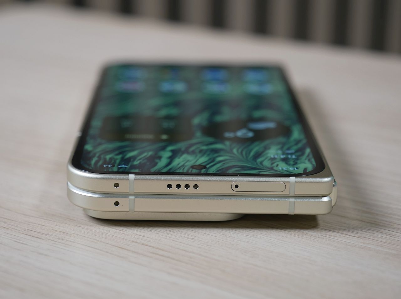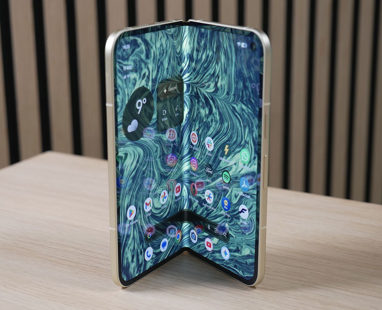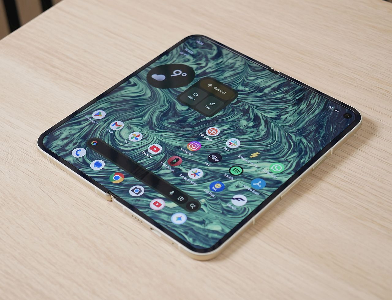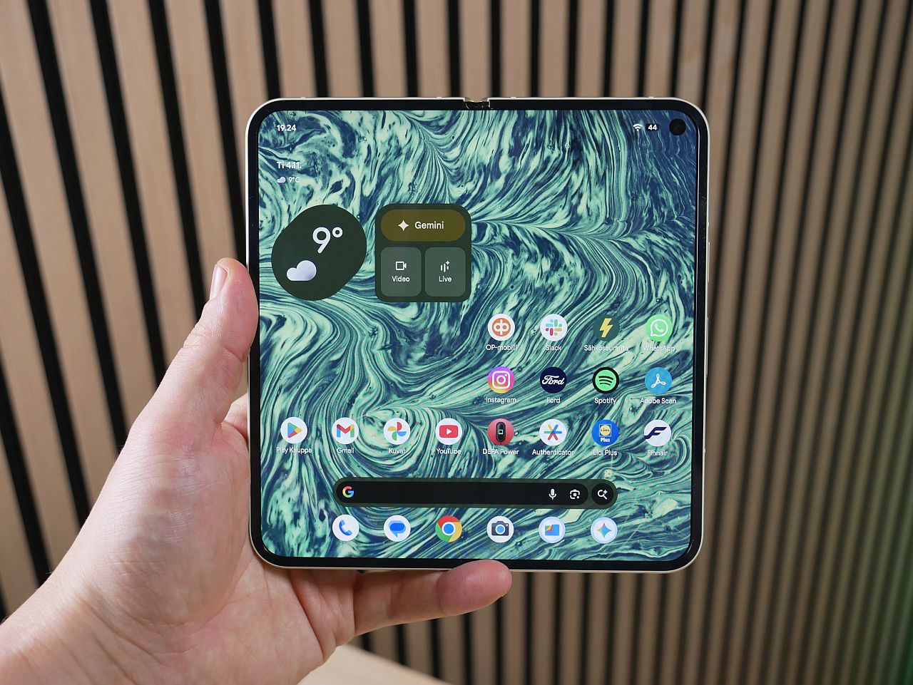 Ulkoisesti Pixel 10 Pro Fold näyttää lähes tismalleen samalle kuin edeltäjämalli – laitteet erottaa toisistaan lähinnä uudistuneiden värivaihtoehtojen osalta. Kymppiin tarjolla olevia värejä ovat siniharmaa Moonstone sekä vihertävä Jade, jota testikappaleemmekin edustaa.