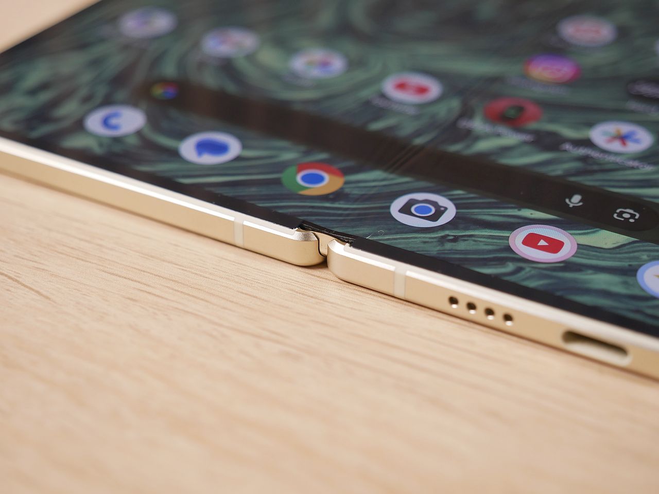 Pixel 10 Pro Foldin laatuvaikutelma on sinällään hyvä – puhelin tuntuu kädessä tukevalta ja hyvin viimeistellyltä. Kehysrakenne on alumiinia ja muut ulkopinnat Gorilla Glass Victus 2 -suojalasia. Takakuori ja alumiinikehys ovat viimeistelty miellyttävän mattapintaisiksi, siinä missä saranan kansilevy on kiiltäväpintainen – tällä Google on halunnut korostaa saranaa ja laitteen kuulumista Pro-mallistoon.