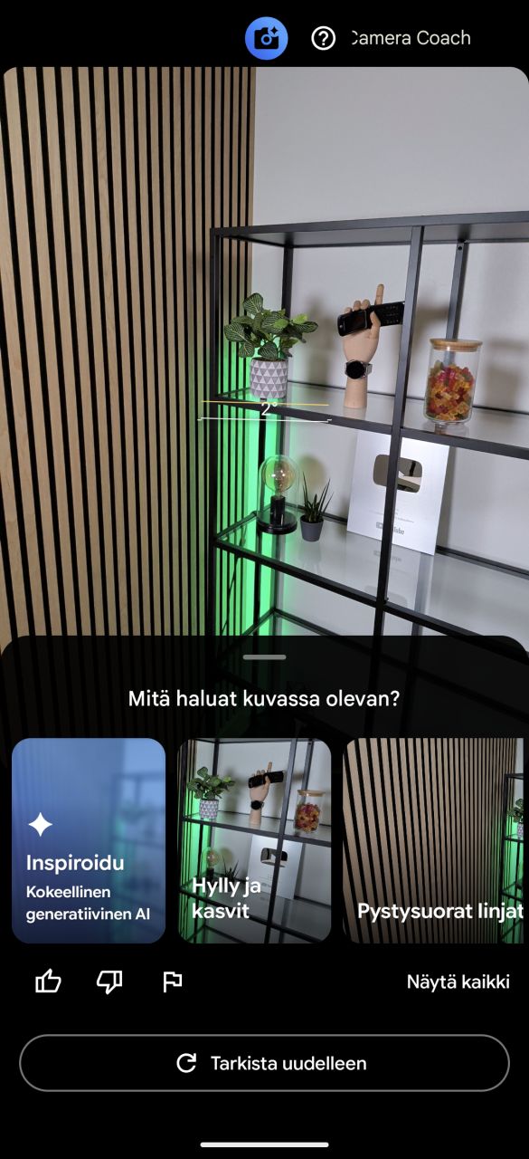 Kameraan liittyvänä Pixel 10 -malliston uutena erikoisominaisuutena Camera Coach -ominaisuus analysoi kuvausnäkymän sisältöä ja pyrkii antamaan käyttäjälle vinkkejä ja portaittain eteneviä ohjeita mm. kuvakulman ja rajauksen osalta parhaan otoksen aikaansaamiseksi. Itse en kokenut sitä erityisen hyödylliseksi, mutta kokemattomammat kuvaajat saattavat saada ominaisuudesta iloa. Jo Pixel 9 -mallistosta tuttuja tekoälyä hyödyntäviä kuvausominaisuuksia ovat mm. henkilön lisäämisen ryhmäkuvaan mahdollistava Add Me, ryhmäkuvan kasvojen ilmeiden muokkaamisen mahdollistava Best Take, joista molemmat tekevät minkä lupaavat, sekä Pro-mallien erikoisominaisuudet Video Boost sekä Super Res Zoom, jotka testattiin jo Pixel 9 Pro -mallien yhteydessä.