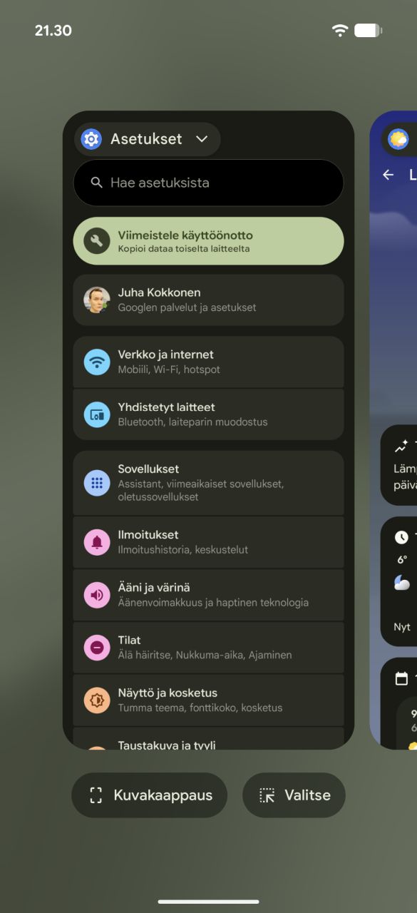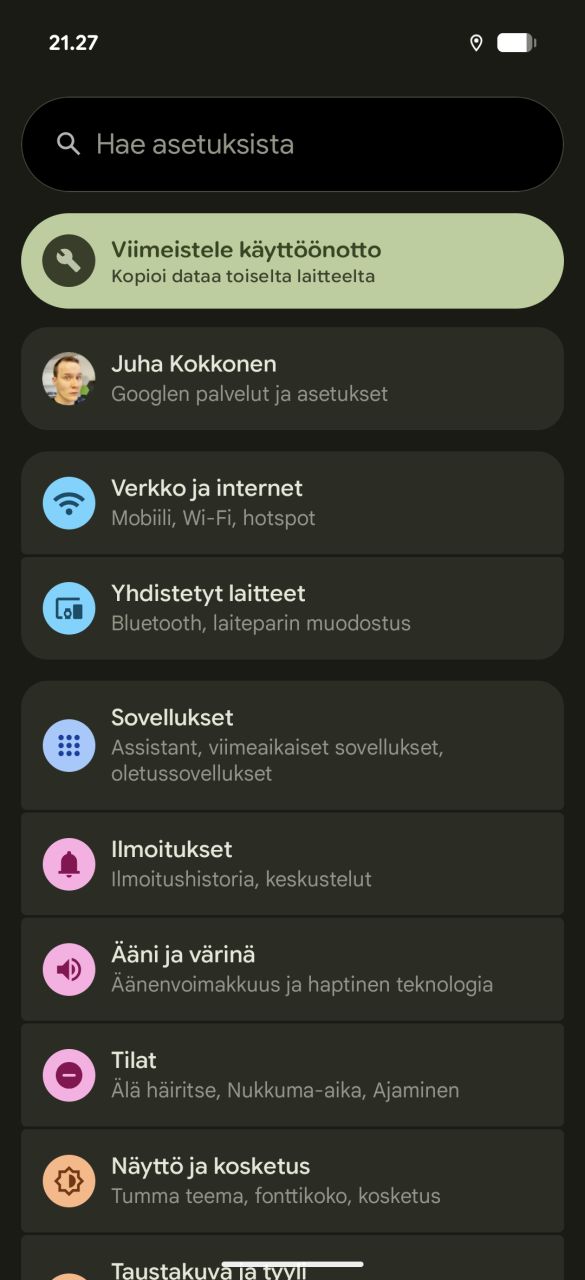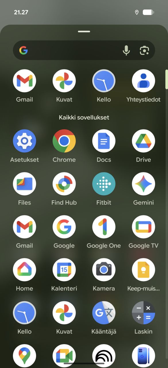 Sovellusvalikoima luottaa luonnollisesti ainoastaan Googlen omiin vakiosovelluksiin, eikä esiasennettuna ole mitään kolmannen osapuolen sisältöä. Viime vuoden tapaan kaikki Pixel-puhelimien lisäsovellukset (Pixel Studio, Pixel Screenshots, Call Notes) eivät ole toiminnassa meillä Suomessa.