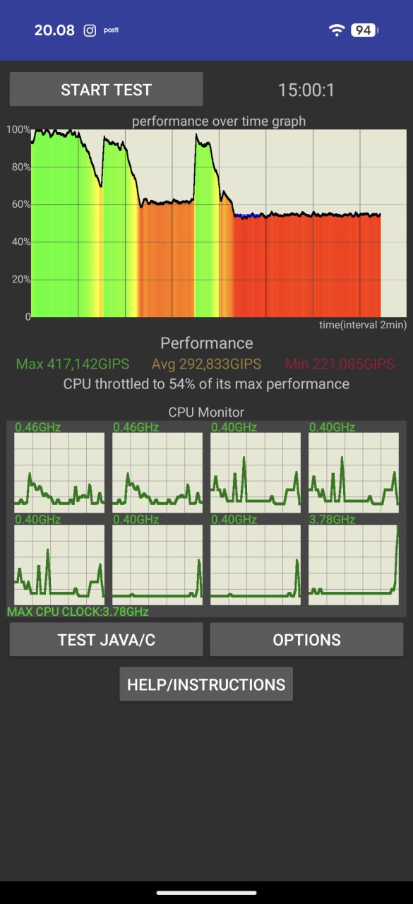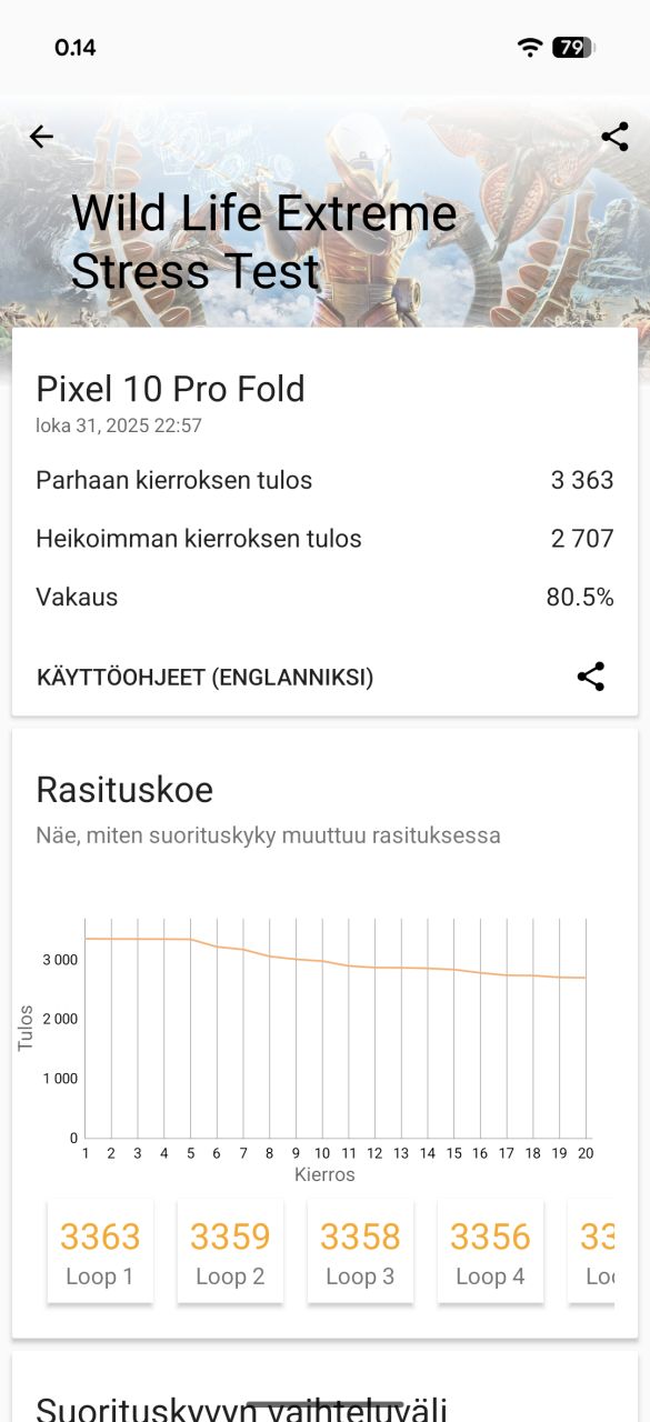 Taittuvissa puhelimissa rakenne asettaa oman haasteensa piirin jäähdytykselle, eikä Google tunnu löytäneen salaista asetta sen selättämiseen. Edeltäjämalliin nähden Pixel 10 Pro Fold itseasiassa rajoittaa suorituskykyään prosessorin osalta suhteessa vielä enemmän, sillä pitkäkestoisessa prosessorirasituksessa CPU Throttling Test -testisovellus antaa heikohkon 54 % tuloksen. 20 minuutin grafiikkarasitustesti 3DMark Wild Life Extreme Stress Test puolestaan antoi varsin hyvän noin 80 % tuloksen ja suorituskykytaso laski melko tasaisesti rasituksen aikana.
