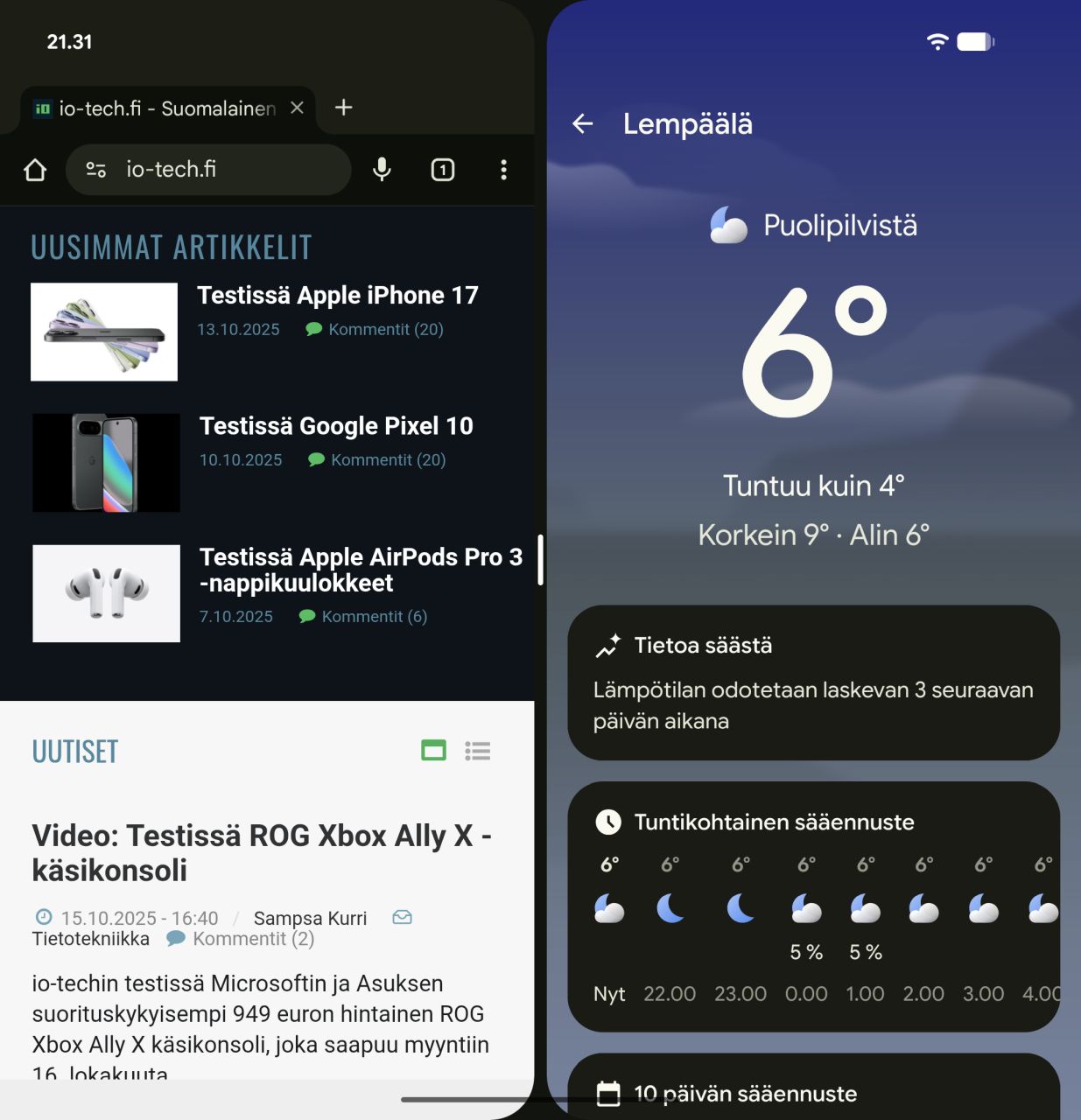 Vertasimme Pixel 10 Pro Foldin kamerakokonaisuutta edellisen sukupolven malliin ja muuttumattomana pysynyt kamerarauta näkyy lähes identtisenä kuvanlaatuna etenkin hyvässä valaistuksessa. Kuvaus ”perushyvä” pätee oikeastaan kaikkiin kolmeen kameraan – lippulaivatasoa ne eivät kuitenkaan ole, eivätkä myöskään pärjää haastavammissa olosuhteissa.