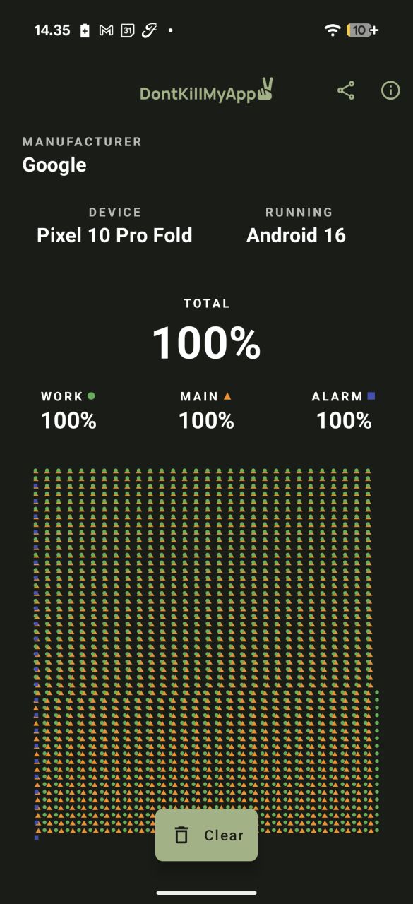 Taustasovellusten virranhallintaa testaavasta Dontkillmyapp-sovellusksesta Pixel 10 Pro Fold sai täyden 100 % tuloksen, joka on linjassa aiempien testaamiemme Pixel-puhelinten kanssa. Toisin sanoen Android 16 toimii kuten Google on tarkoittanut sen toimivan, eikä mukana ole mitään ylimääräisiä taustasovellusten toimintaa tai ilmoituksia rajoittavia virranhallintaominaisuuksia, joita useimmat muut valmistajat lisäävät omiin Android-toteutuksiinsa.