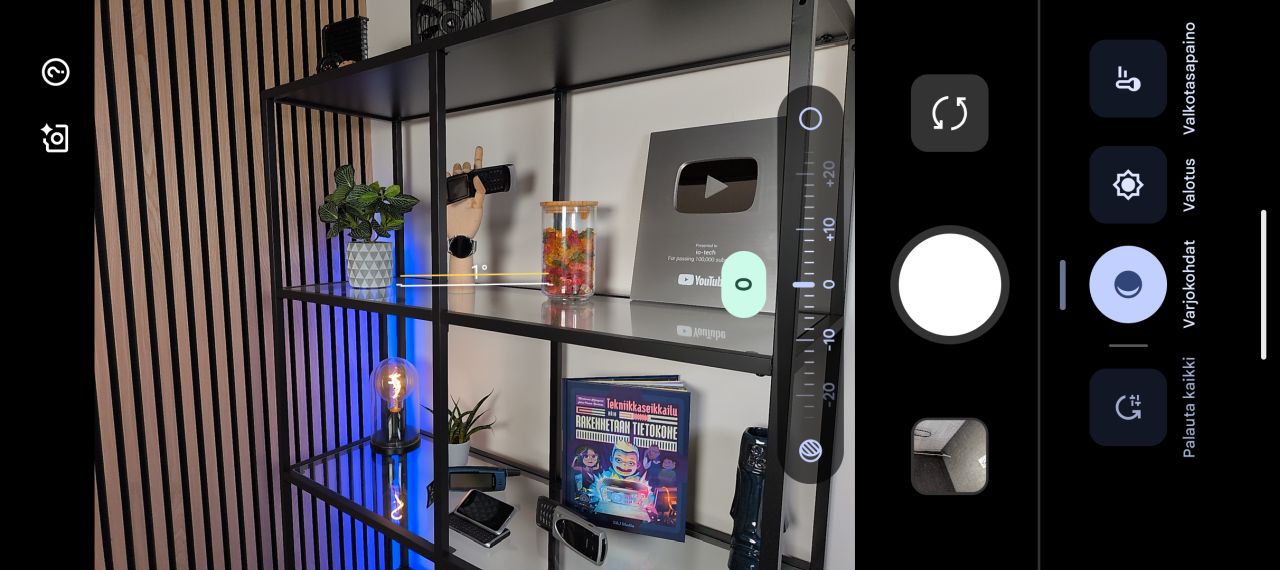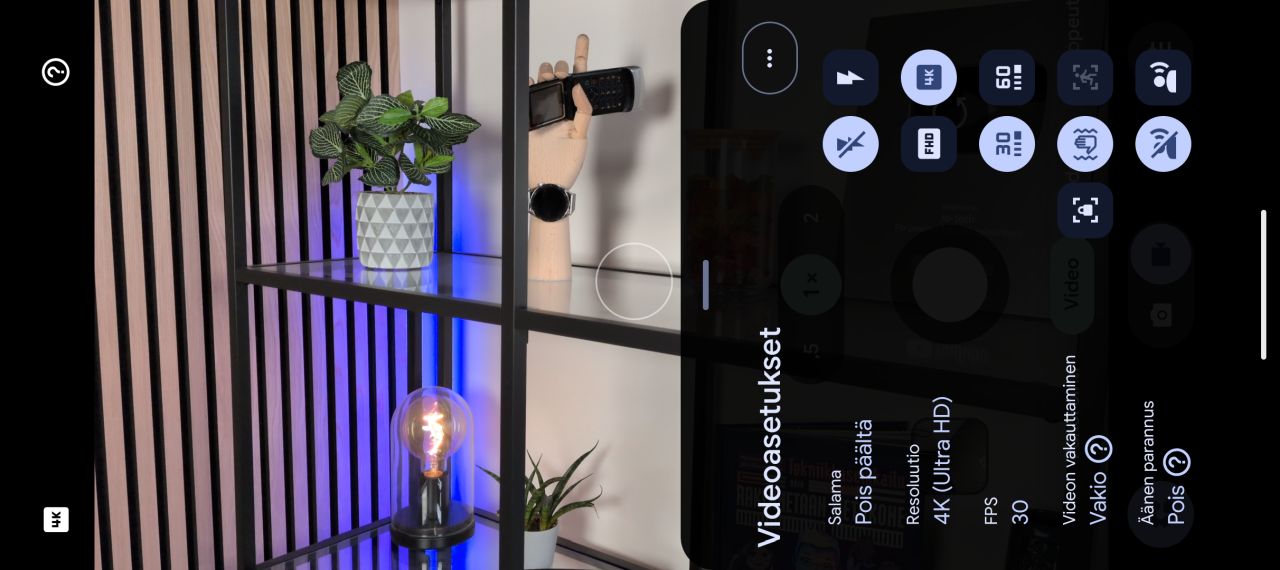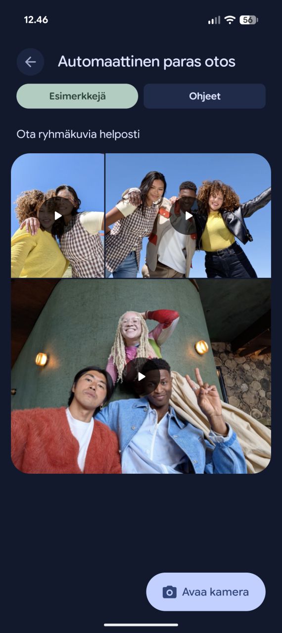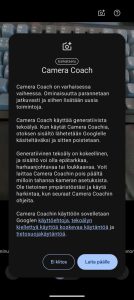 Oikeastaan ainut lisäys on Pixel 10 -mallistossa esitellyn Camera Coach -ominaisuuden kuvakkeen ilmestyminen kuvausnäkymän reunapalkkiin. Camera Coach -ominaisuus analysoi kuvausnäkymän sisältöä ja pyrkii antamaan käyttäjälle vinkkejä ja portaittain eteneviä ohjeita mm. kuvakulman ja rajauksen osalta parhaan otoksen aikaansaamiseksi. Itse en kokenut sitä erityisen hyödylliseksi, mutta kokemattomammat kuvaajat saattavat saada ominaisuudesta iloa. Kameran asetuksista päälle voi puolestaan kytkeä Auto Best Take -ominaisuuden, joka ottaa kahden tai useamman henkilön kuvissa automaattisesti sarjan kuvia, joista se yhdistää henkilöille parhaat ilmeet ja karsii joukosta esimerkiksi suljetut silmät.