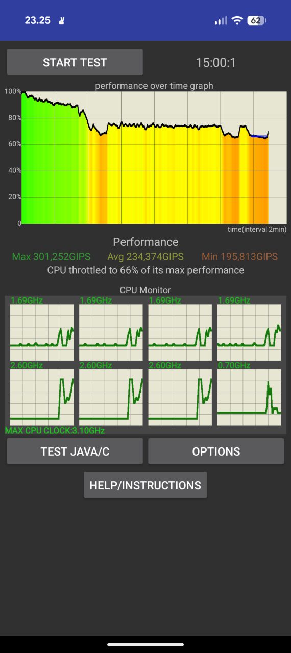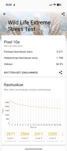 Pitkäkestoisessa suorituksessa ja sen perusteella myöskään jäähdytyksessä ei ole tapahtunut vuodessa mainittavia parannuksia. Pixel 10a:ssa ei tiettävästi ole edelleenkään höyrykammiojäähdytystä ja CPU Throttling -prosessorirasitustestissä saadut noin 65 % tulokset ovat parin prosenttiyksikön sisään linjassa edeltäjämallin kanssa. 20 minuutin 3DMark Wild Life Stress Test -grafiikkarasitustestissä Pixel 10a sai vajaan 70 % tuloksia, jotka ovat myös melko linjassa edeltäjänsä kanssa.