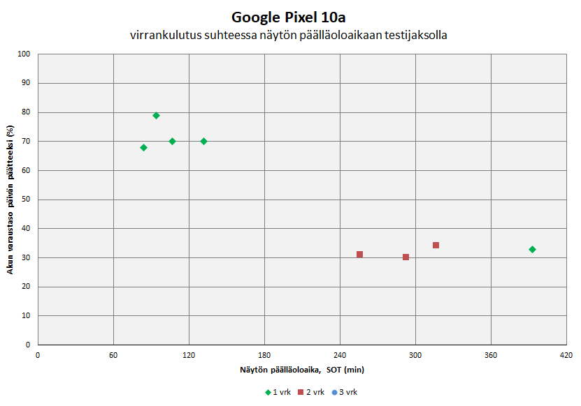 Käyttötestijaksolla Pixel 10a:n akunkesto oli keskitasoa, eikä merkittäviä muutoksia edeltäjämalliin nähden havaittu tällä(kään) saralla.
