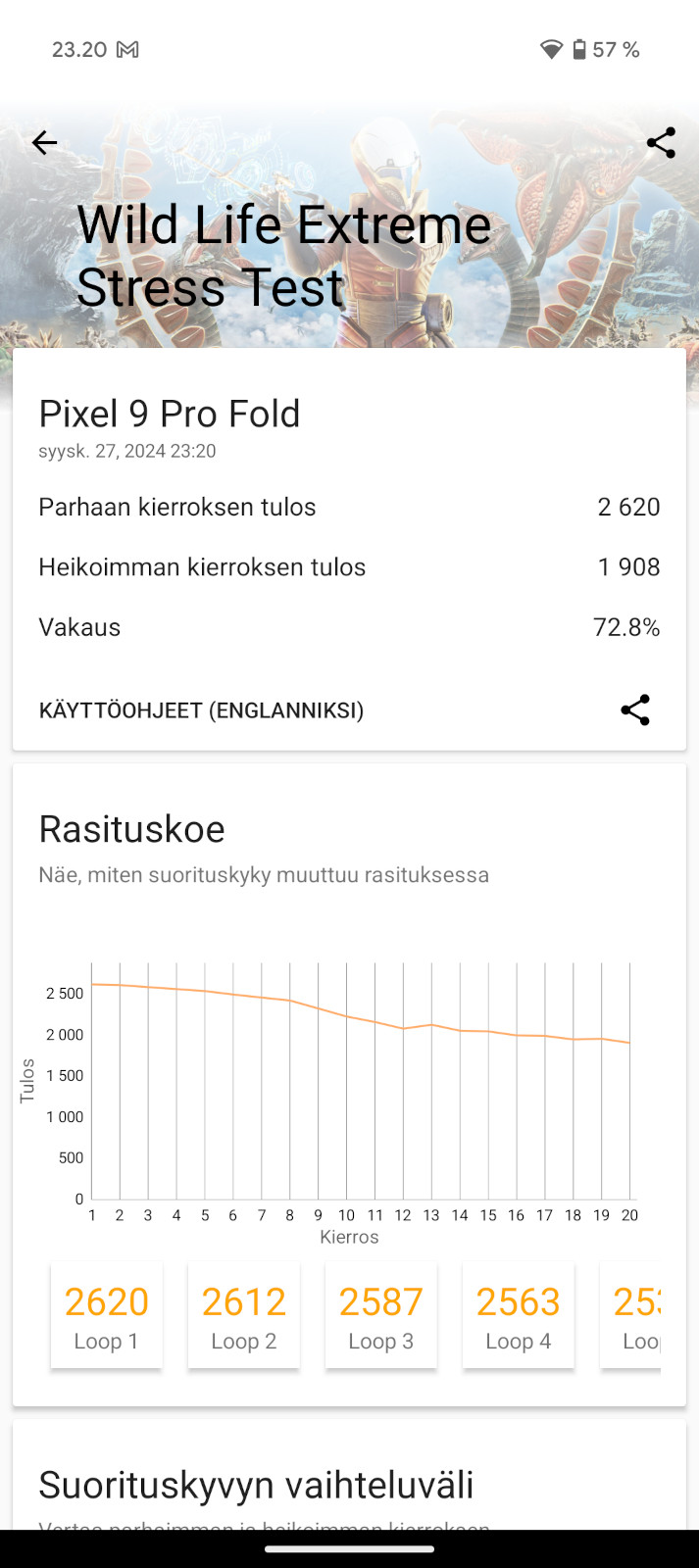 Heikohkoksi jäävä suorituskyky ei harmillisesti tarkoita myöskään erityisen hyvää pitkäkestoisen rasituksen sietoa, sillä prosessorirasituksessa tulos on jopa heikko. Sinänsä Foldin kannalta positiivisena yksityiskohtana taittuvanäyttöinen puhelin pärjäsi CPU-puolen rasitustestissä kuitenkin perinteisellä rakenteella varustettua XL-sisarustaan paremmin, mikä on harvinaista. GPU-puolella suorituskyvyn lasku on paljon hillitympää ja jäähdytys toimi jopa hyvin laskentatehon pysyessä joko vajaassa 73:ssa tai peräti vajaassa 87 prosentissa maksimista riippuen siitäkö onko puhelin auki vai ei.
