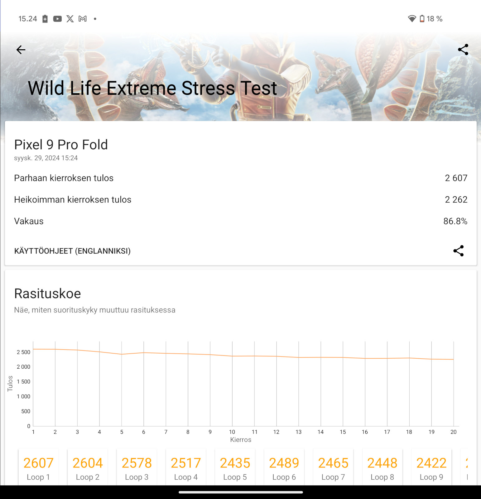 Akunkesto Pixel 9 Pro Foldissa osoittautui testijaksolla luokassaan hyväksi. Yhden päivän käyttöaikojen pyöriessä yhden ja kolmen tunnin välimaastossa jäi akkua useimmiten vähintään 50 prosenttia. Kahdenkin päivän ylitykset onnistuivat kohtalaisen hyvin, joskin kovemman käytön jälkeen puhelinta joutui toisena iltana latailemaan jo hieman ennen tavanomaista nukkumaanmenoaikaa. Kertaalleen puhelin jaksoi läpi kolmenkin päivän, mutta tuolloin käyttö oli todella kevyttä.