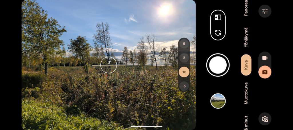 Käytettävyydeltään sovellus on vikkelä, eikä sen käyttölogiikasta jäänyt ainakaan itselleni valittamisen aihetta. Hämärässä sovellus käyttää automaattista yökuvatilaa, jonka voi halutessaan ottaa myös pois päältä. Pääkameran 1x:n ja telekameran 5x:n väliin Pixel tarjoaa myös 2x-tilan, joka käyttää pääkameraa kuvien ottamiseen.
