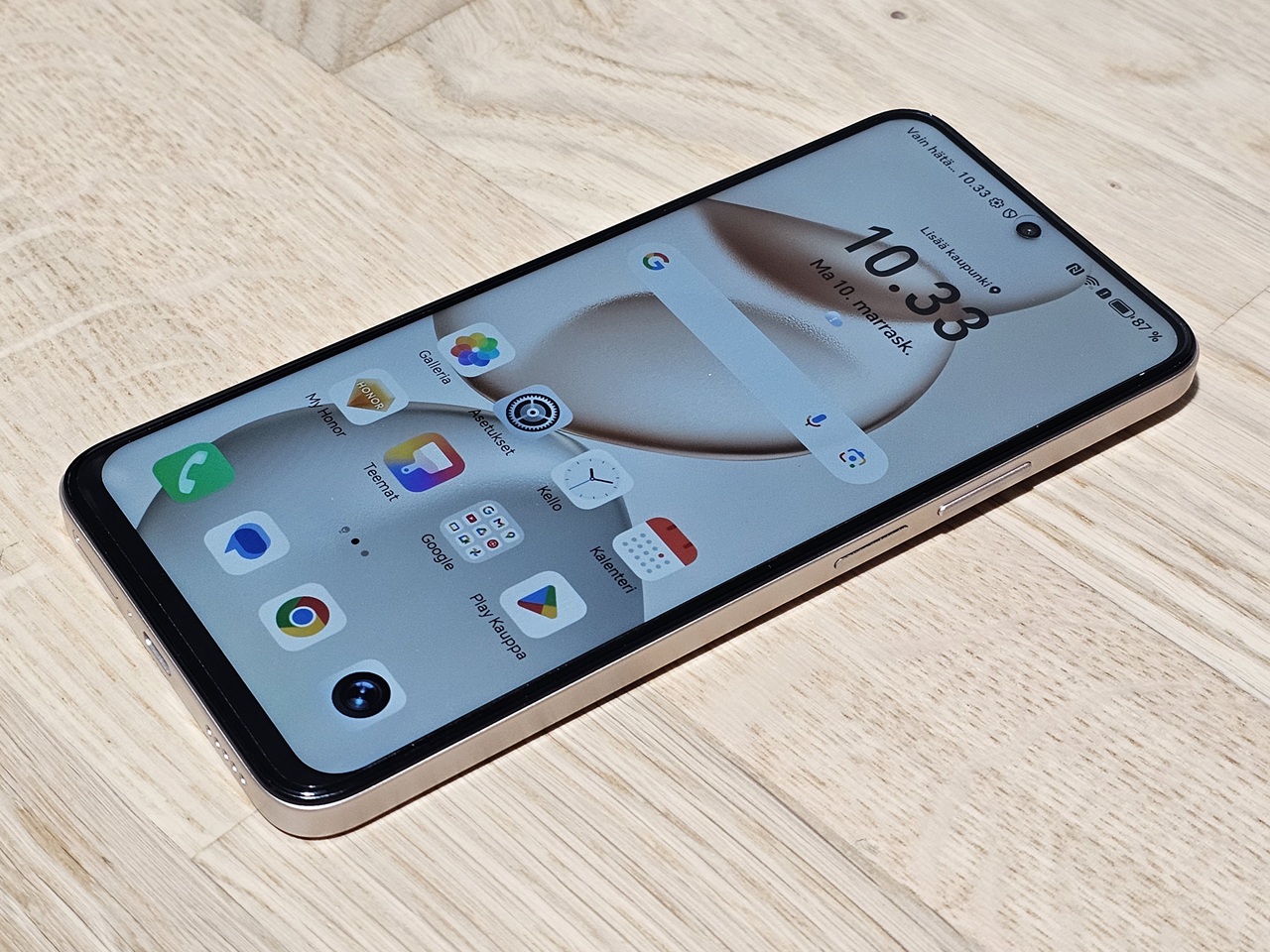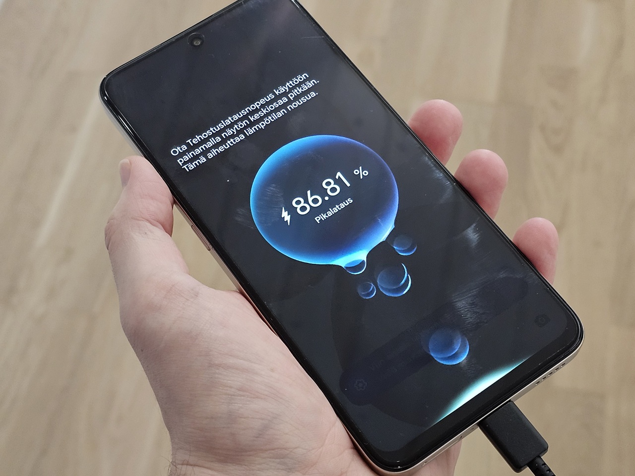 Honorin omaa SuperCharge-laturia ei testijaksolla ollut käytössä, ja latausta testattiin Samsungin 45 W:n laturilla (USB PD PPS), joka sekin aktivoi 400 Smartin pikalatauksen ja latasi akun tyhjästä täyteen ajassa 1 h 6 min. Vartissa akku latautui 18 prosenttiin ja puolessa tunnissa 39 %:iin. Aivan markkinoiden kärkipäätä latausnopeus ei siis ole, mutta kuitenkin varsin riittävä tämän hintaluokan puhelimelle.