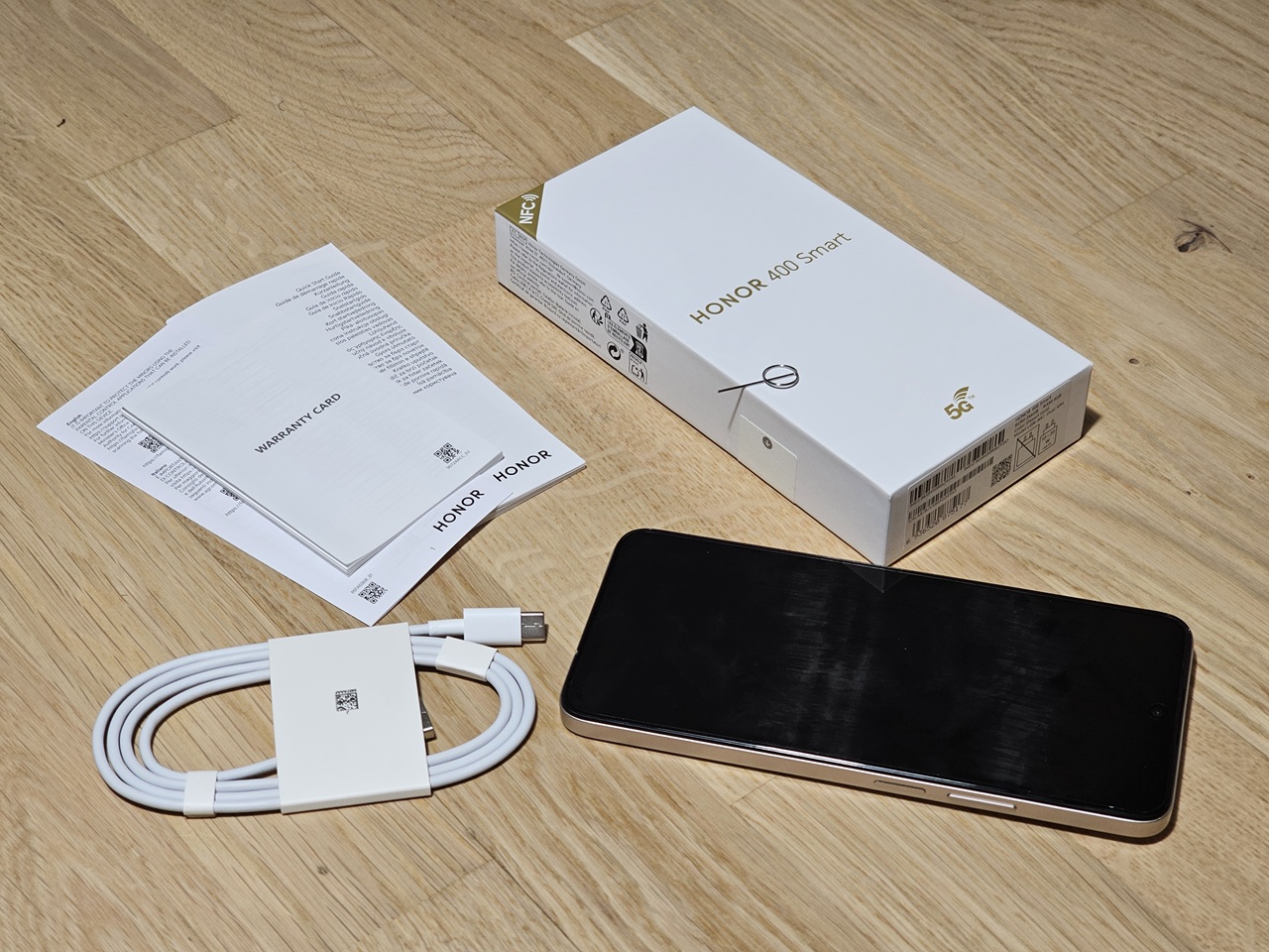 Valkoinen myyntipakkaus on identtinen viime vuoden pakkauksen kanssa ja siinä toimitetaan itse laitteen lisäksi ohjevihkoset, SIM-korttikelkan avaustyökalu ja latauskaapeli (USB-A–USB-C), mutta ei verkkovirtalaturia. Honorin oma SuperCharge-laturi (66 W) kustantaa noin 30 euroa, mutta muutkin USB-C-laturit käyvät.