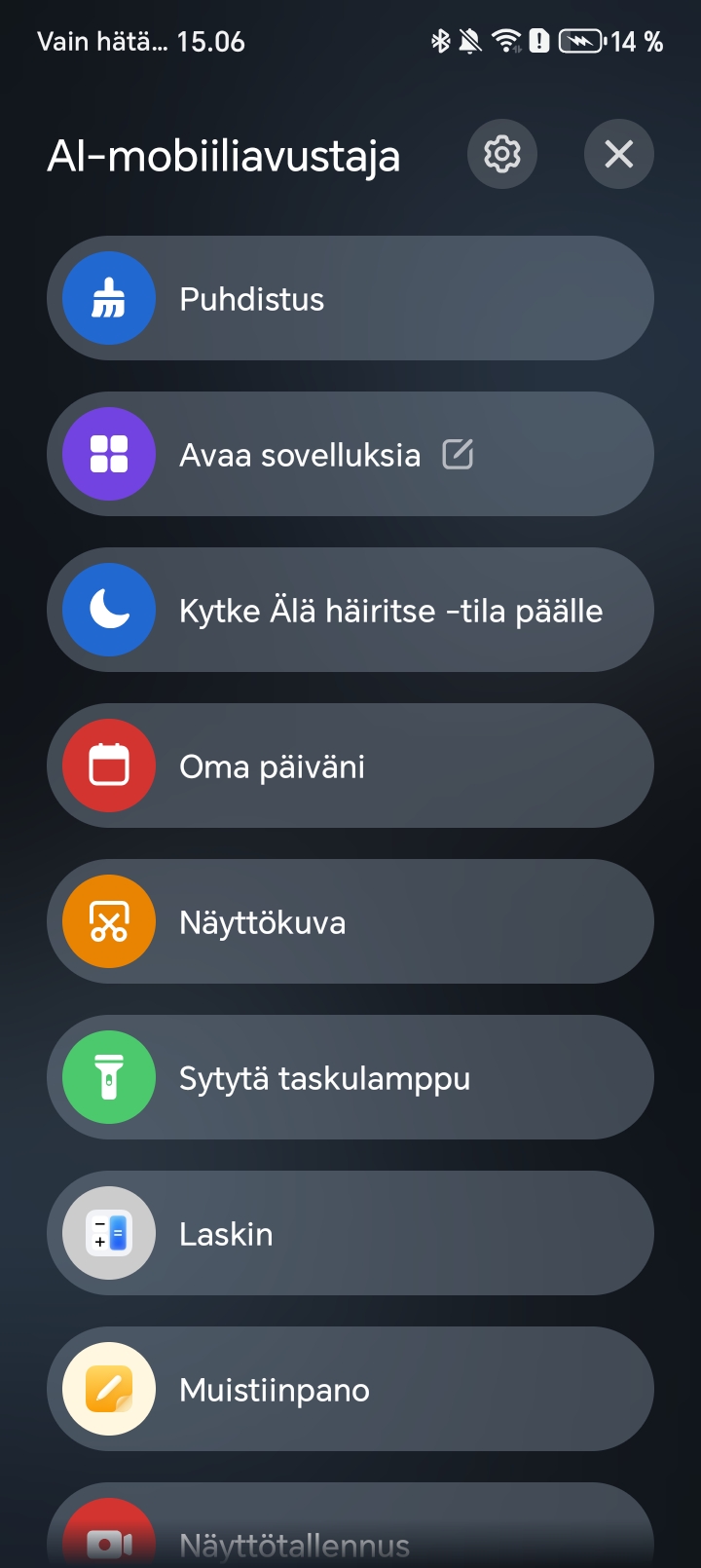 Puhelimessa on käytettävissä Googlen Gemini-tekoälyn keskustelutoiminto virta-/lukituspainiketta pitkään painamalla, mutta vasemman kyljen AI-painike avaa erillisen valikon suositelluista toiminnoista (viides näyttökuva), joita ovat esimerkiksi välimuistin siivoaminen, taskulamppu tai laskin. Toiminto ilmeisesti oppii useimmin käytettyjä toimintoja ja osaa suositella niitä AI-näkymässä. Painike jää kuitenkin hieman raakileeksi, sillä kaikkiin toimintoihin, joihin se avaa ”oikotien”, pääsee melko nopeasti myös perinteistä reittiä. Joitain tekoälytoimintoja on Honorin mukaan myös tulossa vasta tulevaisuuden päivityksissä, eivätkä kaikki niistä välttämättä toimi Suomessa/suomeksi.