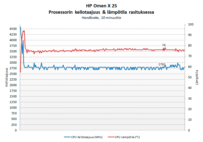 8-ytimisen prosessorinsa ansiosta Omen X 2S suoriutui hyvin prosessoripainotteisissa testeissämme. Prosessorin jäähdytyksessä on käytetty nestemäistä metallia, joka johtaa lämpöä pois prosessorilta huomattavasti perinteisiä lämpötahnoja tehokkaammin. Prosessorin jäähdytysratkaisu osoittautuikin testiemme aikana erinomaiseksi etenkin melutason osalta. HP Omen X 2S:n tuottama melu ei juurikaan noussut prosessorin toimiessa 100 prosentin käyttöasteella. Myös 3D -rasituksessa melutaso oli alhainen muihin io-techin testaamiin pelikannettaviin verrattuna ylittäen kuitenkin 40 desibelin rajan, jota voi kuvailla jo melko äänekkääksi.