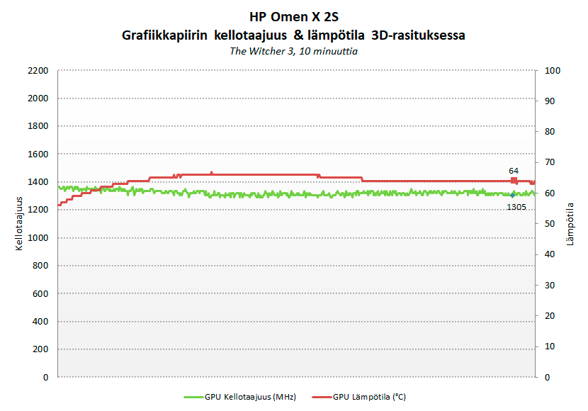 The Witcher 3:ssa Omen X 2S:n keskimääräinen ruudunpäivitysnopeus oli parhailla kuvanlaatuasetuksilla 84 FPS:ää, jääden jälleen hieman ROG GL704GW:lle, mutta minimissä Omen oli tässäkin testissä sitä yli 10 FPS:ää edellä.