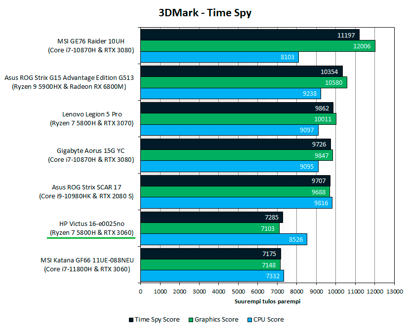 3DMark Time Spy -testissä Victus 16:n kokonais- ja grafiikkatulos oli melkein tasoissa MSI Katana GF66:n kanssa, mutta CPU-testin tulos oli 16 % korkeampi.