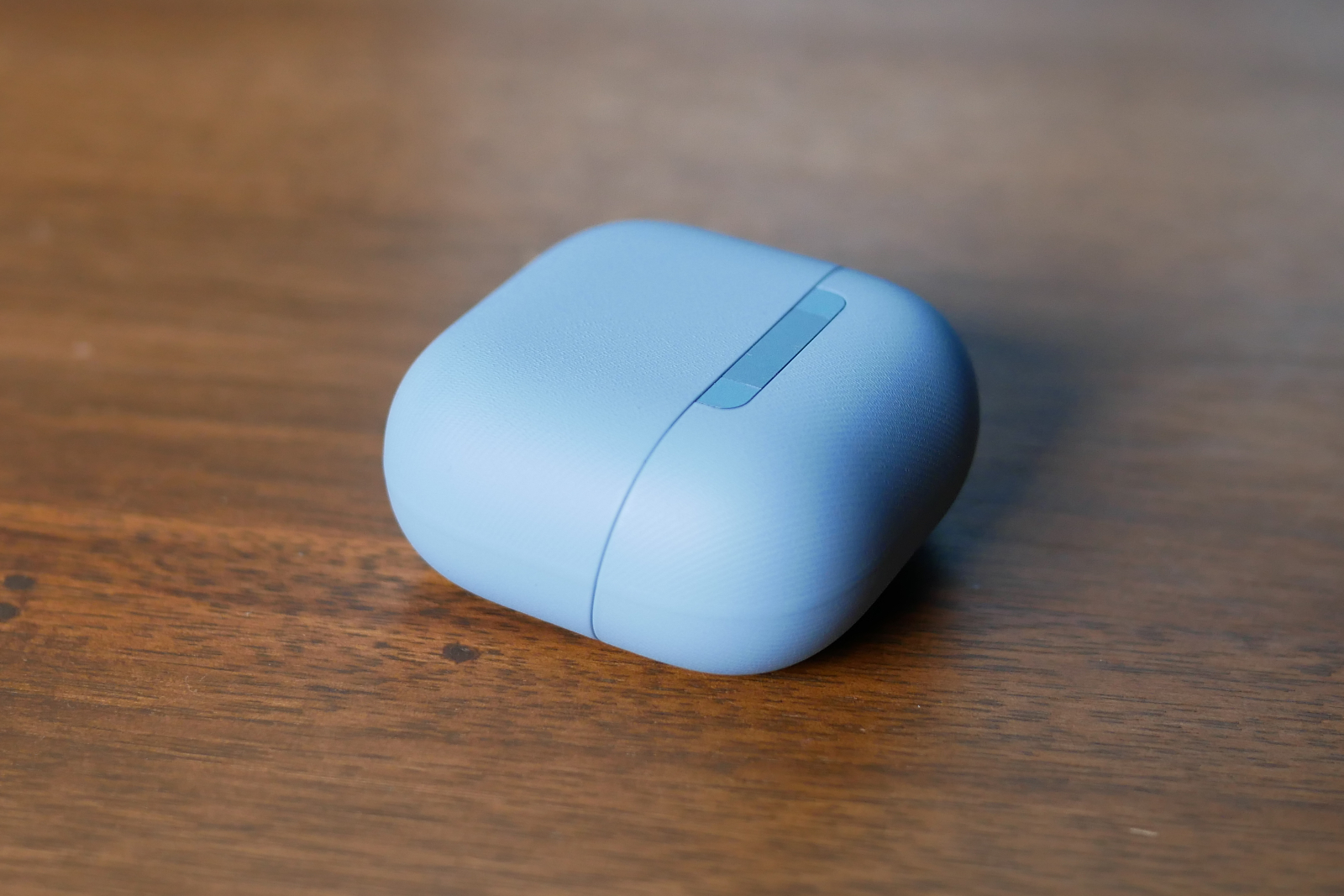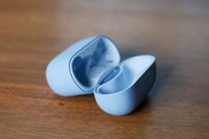 Kuulokkeiden latauskotelo itsessään on mukavan siro ja helposti taskuun sujahtava. Kuulokkeet sijoittuvat koteloon mielenkiintoisesti hieman ristiin C-Bridge-osien mennessä toistensa lomitse.