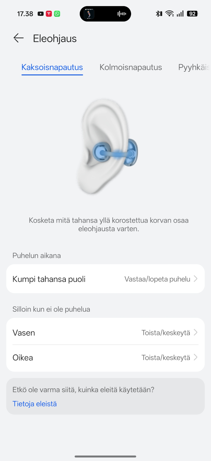 Lisäksi elekomentoja on kehitetty tuomalla mukaan äänenvoimakkuutta säätävät liu’utuseleet korvan taakse sijoittuvaan Comfort Beam -osaan. Testijaksolla nämä myös toimivat varsin näppärästi. Näpäytyseleet musiikin pysähdykseen vaikuttaisivat toimivan myös pipon läpi, eli kuulokkeet tunnistavat tärähdyksen, mikä on mukava ominaisuus. Näiden lisäksi tuettuna on myös liiketunnistus ja esimerkiksi puhelut voi hyväksyä tai hylätä päätä nyökyttämällä tai ravistamalla.